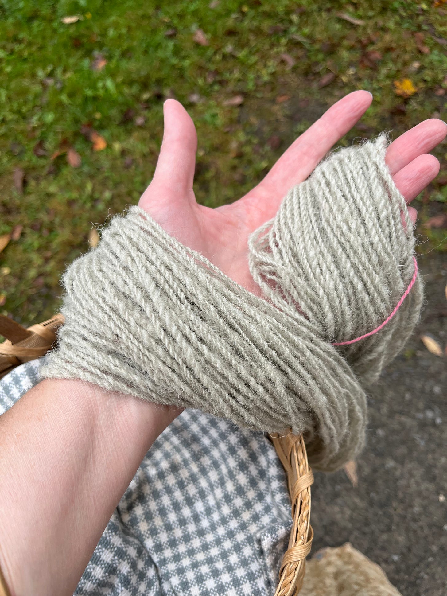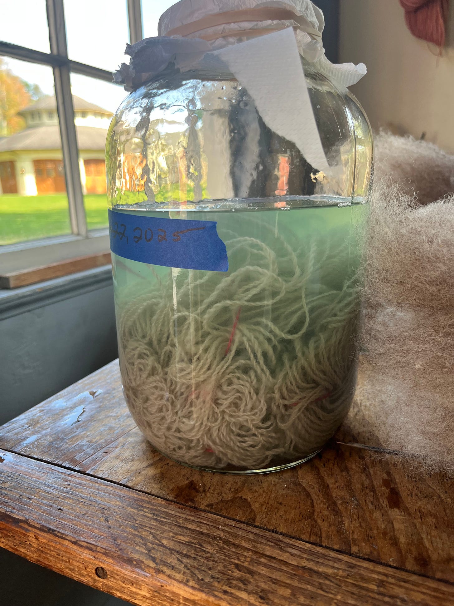 Step four: when the liquid is blue-green-ish, add yarn. This was handspun that came from the Fenimore Farm’s sheep, who may or may not be mostly a Cheviot-Merino cross.2