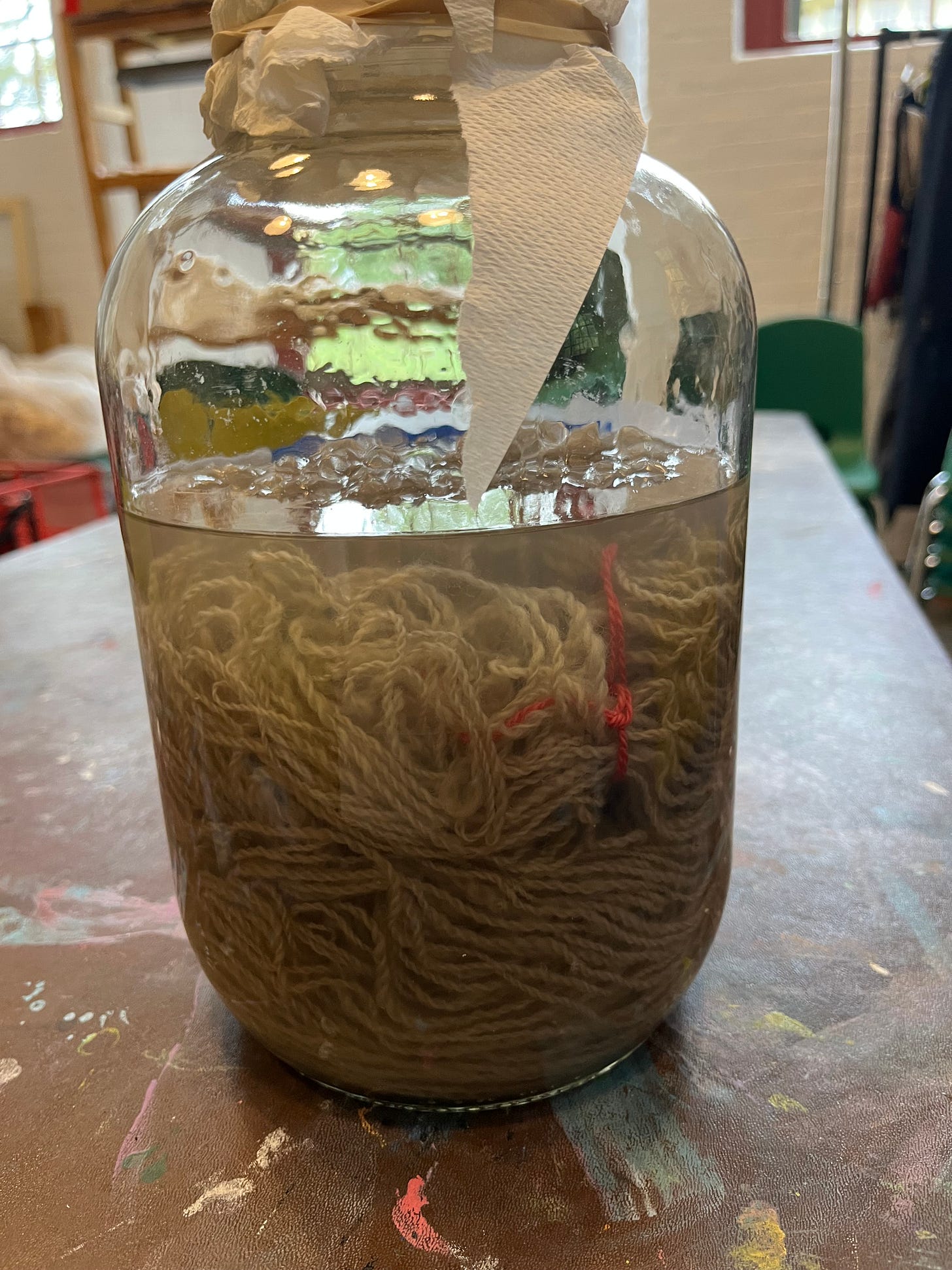 I use 1 part ammonia to 2 parts water. Toss in as much copper as I can scavenge—wire, pieces of pipe and tubing. My local hardware store is happy to give me the odd bits left over after they cut copper pipe for customers. I let the ammonia eat the copper for about a month. Then I add a handful of fiber to the pot and let it sit about 30 minutes, sometimes longer. If that batch of fiber looks good after a reasonable length soak, I dye another half handful. If that looks good after 30-45 minutes, I will dye another half handful. I stop when the pot isn’t dyeing the fiber. At that point, I add more copper and more 1:2 ammonia and water, then let the pot sit for another month.
